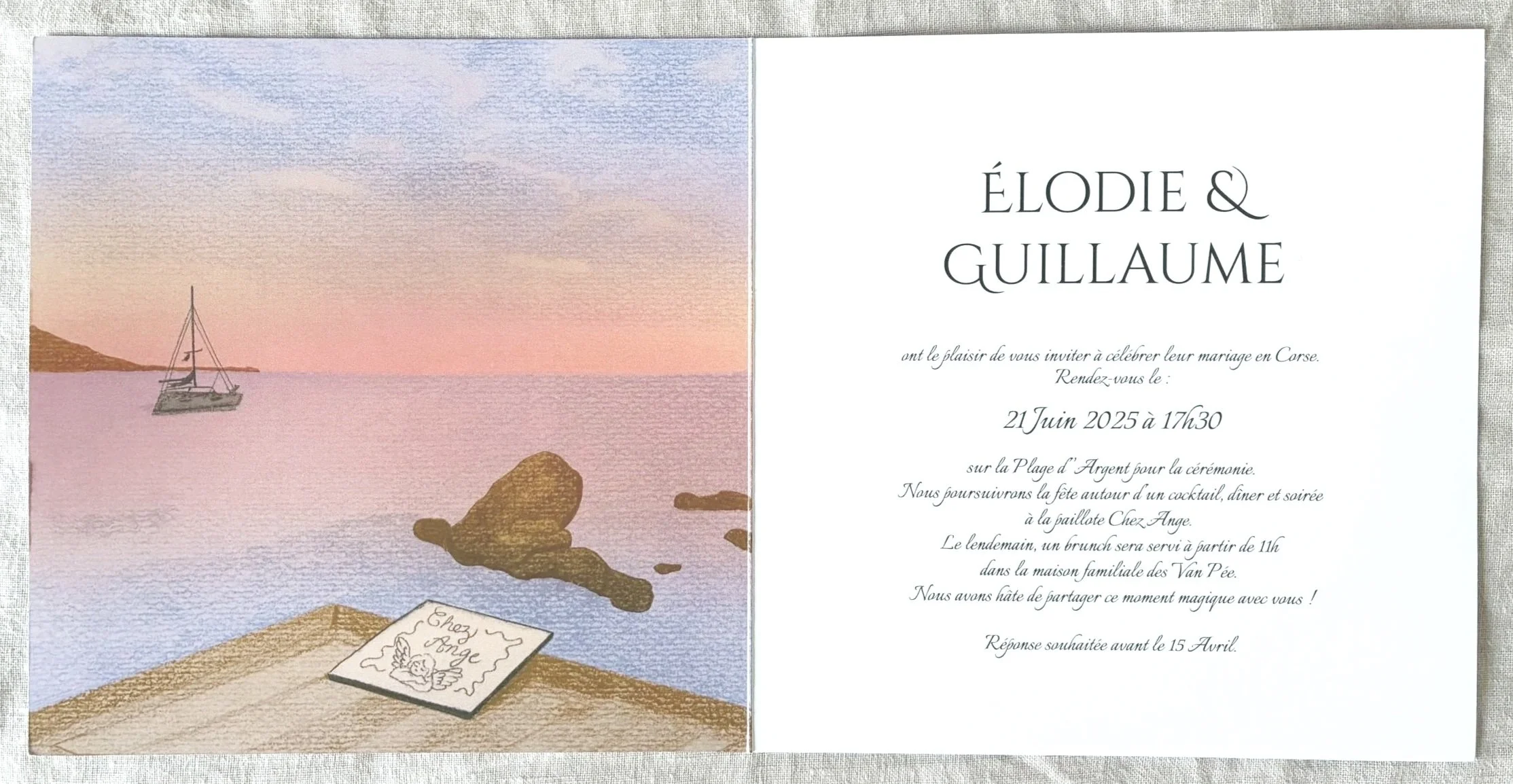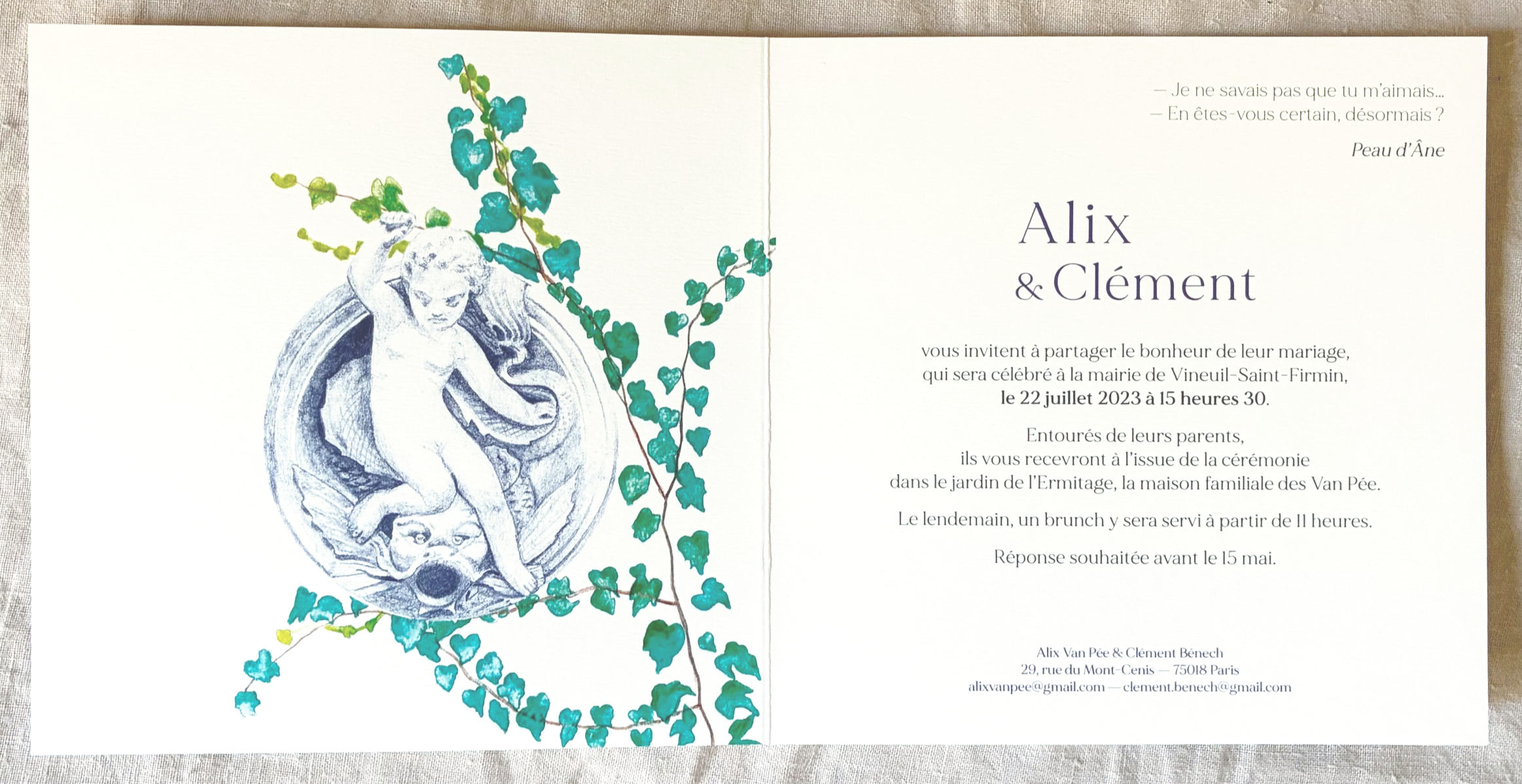 I work with international couples who choose France for its light, its architecture, its particular sense of beauty — and who want that sensibility carried through every element, from the paper you hold in your hands to the portrait your guests take home.